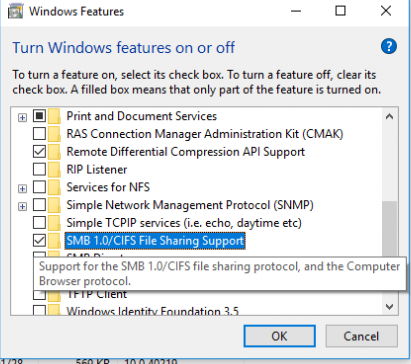 2- بعدها سوف يظهر لك قائمة بالشكل الذي يظهر فى الصورة قم بالبحث عن SMB 1.0/CIFS File Sharing Support وقم بازالة علامة التي بجانبها ومن ثم قم بالضغط علي OK.